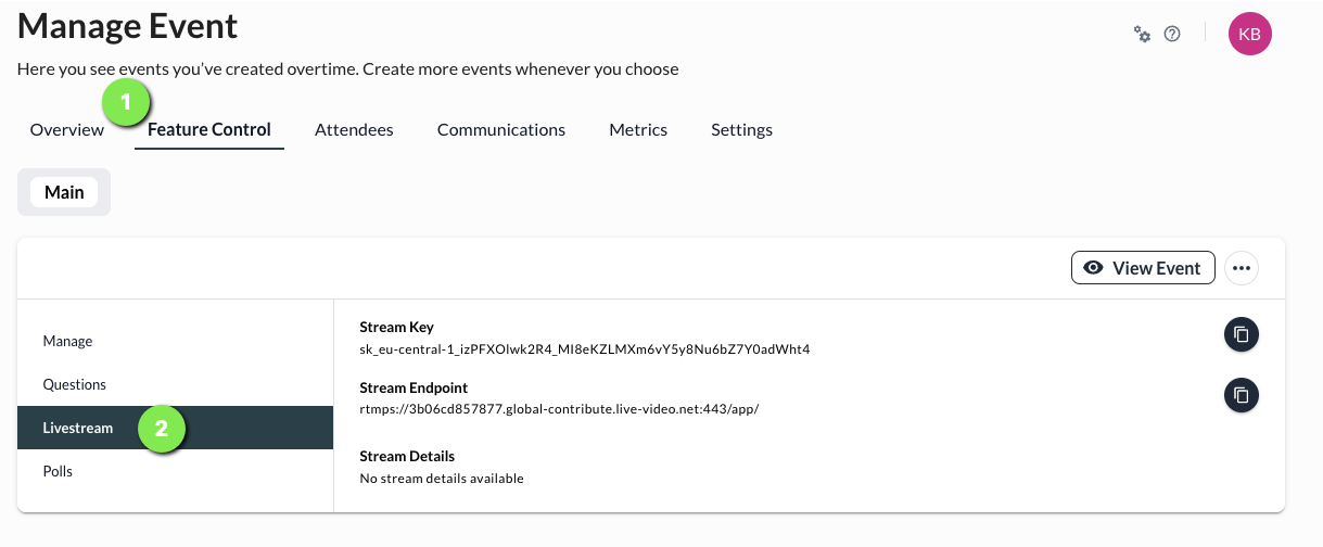 enabled livestream for your event, you will find your stream endpoint and stream key in the Manage Event section.