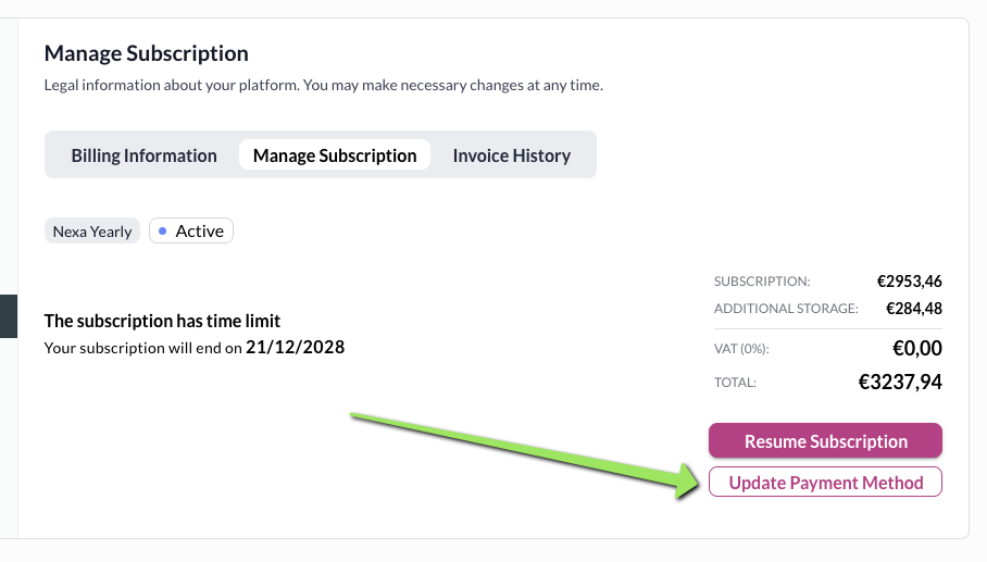 If you need to change the creditcard used to handle payment for Nexa, go to Platform Configuration - Manage Subscription - Manage Subscription