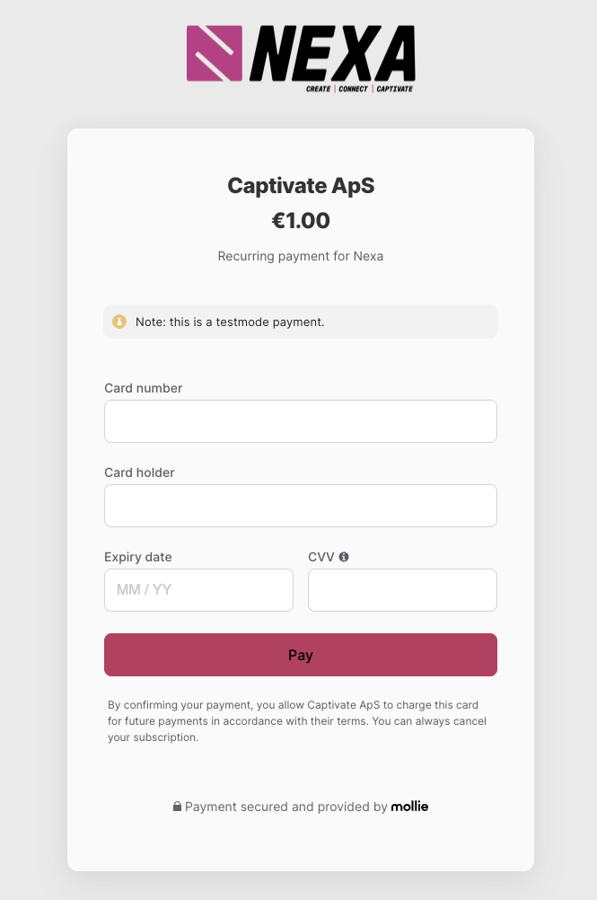 Here you will find a button to update your payment method. We accept all major creditcards like Visa, Mastercard